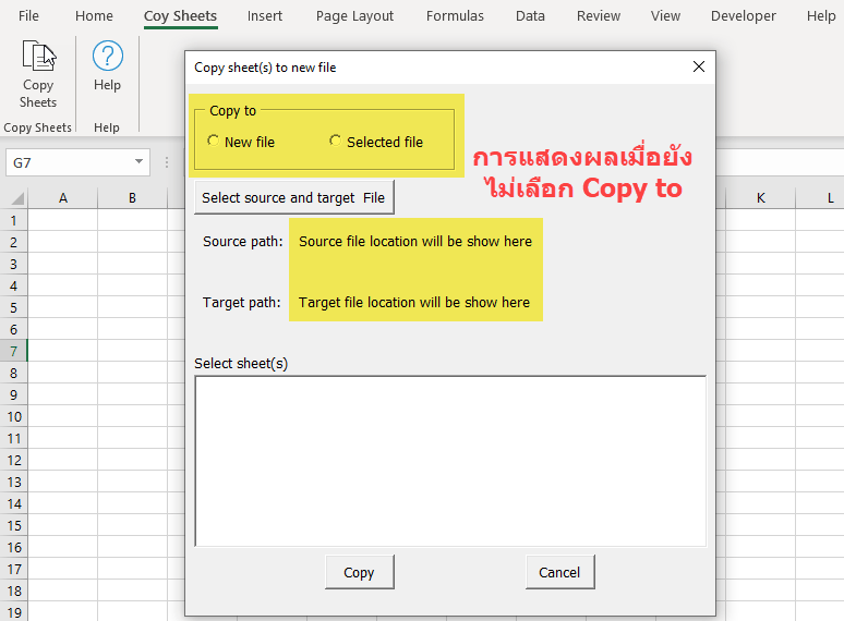 - คลิกปุ่ม Copy เพื่อทำการคัดลอกชีตจากไฟล์ต้นทางไปยังไฟล์ที่เปิดขึ้นมาใหม่