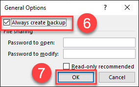 การป้องกันปัญหานี้เราสามารถเลือกที่จะสร้างไฟล์สำรองเอาไว้ได้ เพื่อที่ว่าทุก ๆ ครั้งที่เรา Save ไฟล์ โปรแกรมจะสำรองข้อมูลก่อน Save เอาไว้ให้เราด้วยเสมอ ความสามารถนี้นั้นมีมากับ Excel ตั้งแต่ Version แรก ๆ แต่มักจะไม่ได้ถูกนำมาใช้งาน อาจจะเป็นเพราะเข้าถึงได้ค่อนข้างยาก