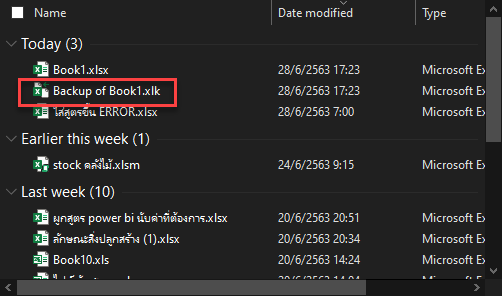 เมื่อทำการ Save ไฟล์ในครั้งถัดไปโปรแกรมจะสร้างไฟล์สำรองมาให้อีก 1 ไฟล์ โดยมีคำว่า Backup of นำหน้าไฟล์ต้นฉบับและมีนามสกุลไฟล์เป็น .xlk มาให้ดังภาพ
