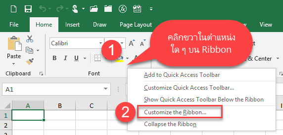 - คลิกขวาในตำแหน่งใด ๆ บน Ribbon จากนั้นเลือก Customize the Ribbon