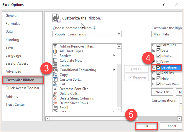 - เลือก Customize Ribbon > Developer > OK