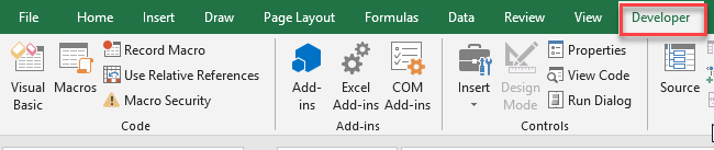 ในการเขียน VBA หรือแม้แต่การใช้งาน Macro ควรเพิ่ม Developer Tab เพื่อความสะดวกต่อการใช้งานเมนูต่าง ๆ อันได้แก่การเพิ่ม Button, TextBox, ComboBox, ListBox และอื่น ๆ รวมถึงการบันทึก Macro การยกเลิกการบันทึกและการเรียกใช้ Macro