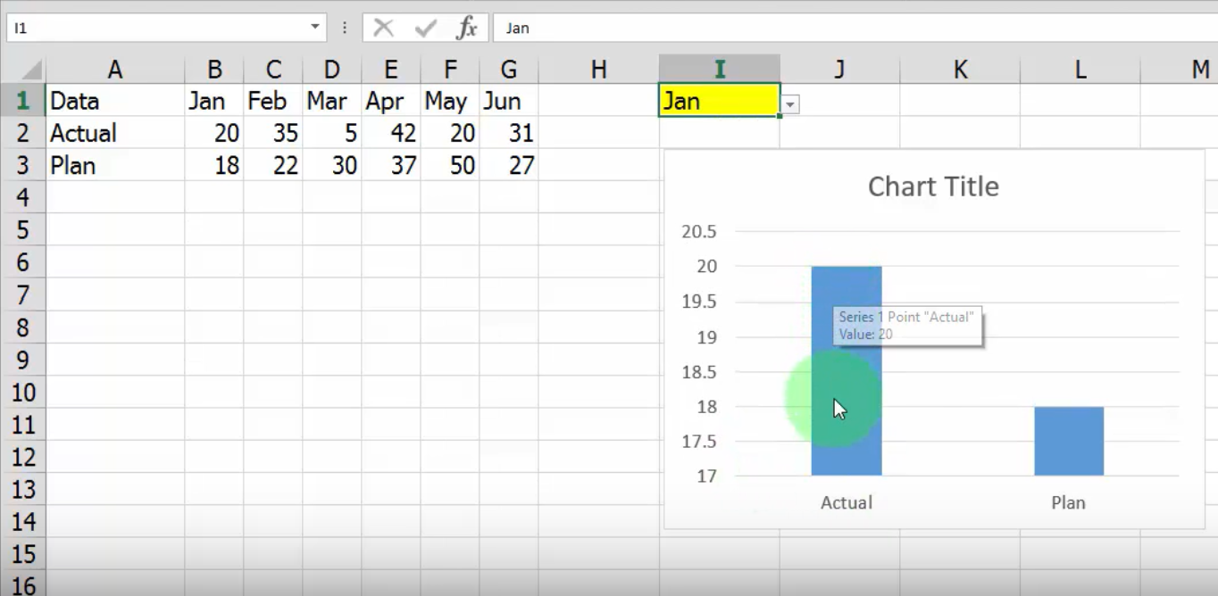 สมมุติมีข้อมูล Actual และ Plan อยู่ในช่วง A1:G3 แยกเป็นรายเดือนแล้วเราต้องการจะดูข้อมูลเป็นกราฟแท่งเปรียบเทียบ Actual กับ Plan เฉพาะเดือนใด ๆ ไม่ได้ดูพร้อมกันหลายเดือนดังภาพ