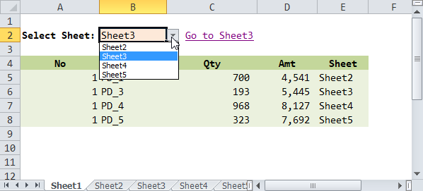 ยกตัวอย่างเช่นตามภาพด้านล่าง Sheet1 จะเป็นชีตสำหรับสรุปข้อมูลของทุกชีตมาแสดงไว้หน้าเดียว เซลล์ B2 จะมีรายการให้ผู้ใช้งานเลือกได้ว่าต้องการจะไปยังรายละเอียดในชีตใด โดยในเซลล์ C2 จะมีการสร้างสูตร Hyperlink เอาไว้ เมื่อผู้ใช้คลิกก็จะไปแสดงรายละเอียดในชีตที่สัมพันธ์กับค่าที่ผู้ใช้เลือกในเซลล์ B2