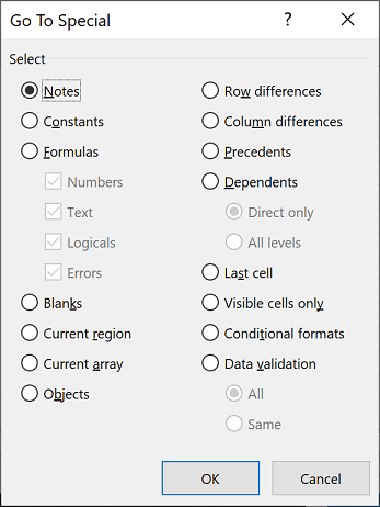 การเข้าถึงข้อมูลแบบพิเศษด้วย Go to Special ซึ่งเป็นเมนูที่สำคัญทีเดียวสำหรับผู้ที่จะใช้ Excel อย่างมืออาชีพ สามารถเข้าถึงเมนูนี้โดยกดแป้น Ctrl + G > Special หรือกดแป้น F5 > Special เพื่อเข้าถึงข้อมูลตามที่ต้องการ ข้อมูลดังกล่าวนี้ได้แก่