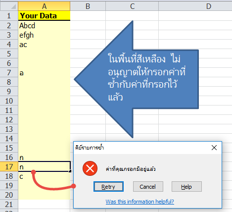 - ในช่อง Error message box กรอก “ค่าที่คุณกรอกมีอยู่แล้ว”
