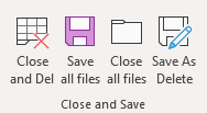 - Save As Delete ทำการ Save ทับไฟล์เดิมพร้อมลบไฟล์ปัจจุบันทิ้ง ยกตัวอย่างเช่น ไฟล์ปัจจุบันชื่อ Book1 (2) โดยเมื่อผู้ใช้เลือก Save ทับไฟล์ Book1 โปรแกรมจะลบไฟล์ Book1 (2) ทิ้งไปเหลือแค่ไฟล์ Book1 แค่ไฟล์เดียว ใช้เมื่อมีการดาวน์โหลดไฟล์มาซ้ำ ๆ และต้องการจะเก็บไว้เพียงไฟล์เดียว