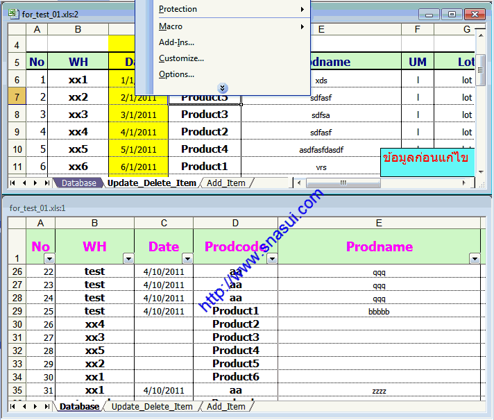 ( เพราะได้สร้างการบันทึกข้อมูลจาก Sheet Add Item แล้ว ซึ่งจากSheet Add Item จะบันทึกข้อมูลไม่สมบูรณ์เพราะเป็นการบันทึกล่วงหน้า เพื่อจองพื้นที่ค่ะ แล้วก็มา Sheet Update_Delete เพื่อเติมข้อมูลให้สมบูรณ์ หรือแก้ไขค่าให้ถูกต้องในกรณ๊ Update หรือลบ Record นั้นๆถ้าเราเลือก Delete ค่ะ )