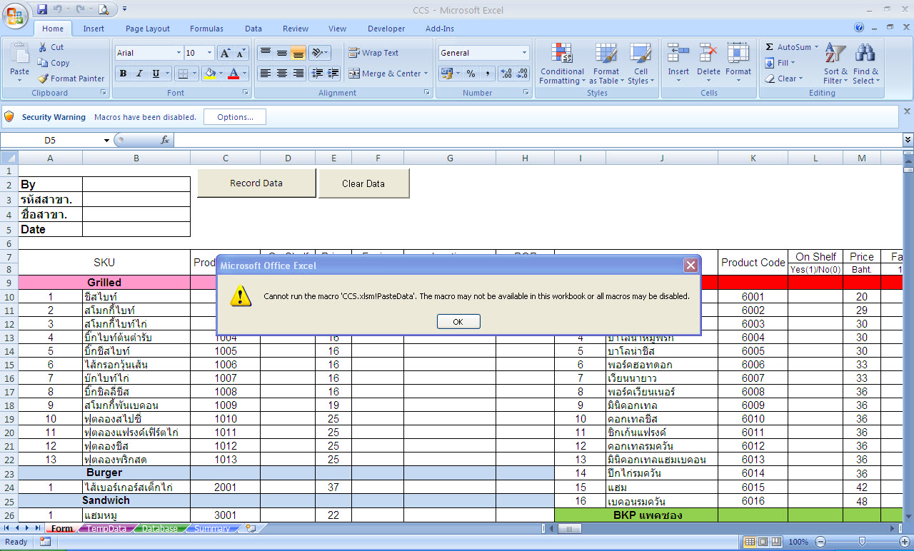 พอดีผมแก้โปรแกรม excel ตามที่อาจารย์แนะนำ และปรับใช้ได้สักระยะหนึ่งโดยไม่มีปัญหา แต่ครั้งล่าสุดที่ได้มีการปรับแก้ (ปรับแก้ตามปกติ ไม่มีอะไรพิเศษ) แต่พอรันโปรแกรม มีการแจ้ง ดังนี้ "Cannot run the macro "ชื่อไฟล์" The macro may not be available in this work book or all macros may be disabled." ตามไฟล์แนบ